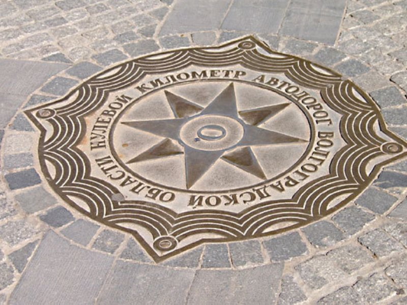 Символический знак, обозначающий Нулевой километр автодорог Волгоградского региона, расположен на площади Павших борцов около Вечного огня. Этот знак сделан в виде огромной звезды из металла. От нее отходят четыре луча, которые символизируют четыре стороны света. Прямо перед звездой видна надпись, в которой сказано, что именно отсюда берут свое начало все дороги Волгоградской области. Появился этот необычный памятник здесь в сентябре 1998 года. Для жителей города он служит своеобразным пунктом отправления в любой уголок России из их родного города. Интересно, что такой же знак установлен и в Москве. Кстати, именно это место для установки памятника было выбрано не случайно. На этой площади постоянно проходят фестивали, праздники и парады. Недалеко от площади находится Главпочтамт.