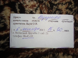 Уважаемый начальник СЛУЖБЫ СУДЕБНЫХ ПРИСТАВОВ Г. ВОЛЖСКОГО! Прошу Вас поднять данные о моем визите к Вам на прием от 06.10.2011 года (16.30 Назаренко Н. В.) и в письменном виде дать разъяснение, по какой причине пристав игнорирует мои звонки, отказывается дать ответы на вопросы и т. д. Это безобразие когда-нибудь закончится? Или стоит мне обвинить пристава в преступном сговоре? Копия моего сообщения будет отправлена в Волгоград, а потом в прокуратуру. ПОРА ВЗЯТЬСЯ ВАШИМ РАБОТНИКАМ ЗА РАБОТУ! А не кормить постоянными обещаниями!